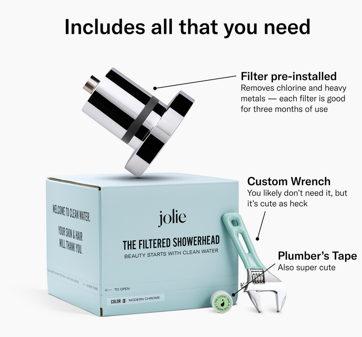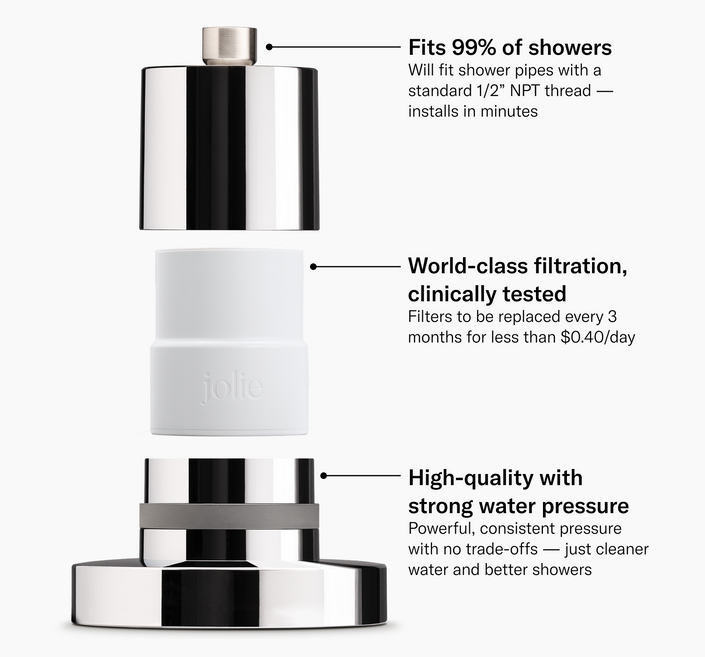 Jolie filters chlorine and heavy metals and is clinically proven to reduce dryness, irritation, and hair shedding. Think of it as Step Zero — the essential start to a routine. Special Black Friday price of $98.